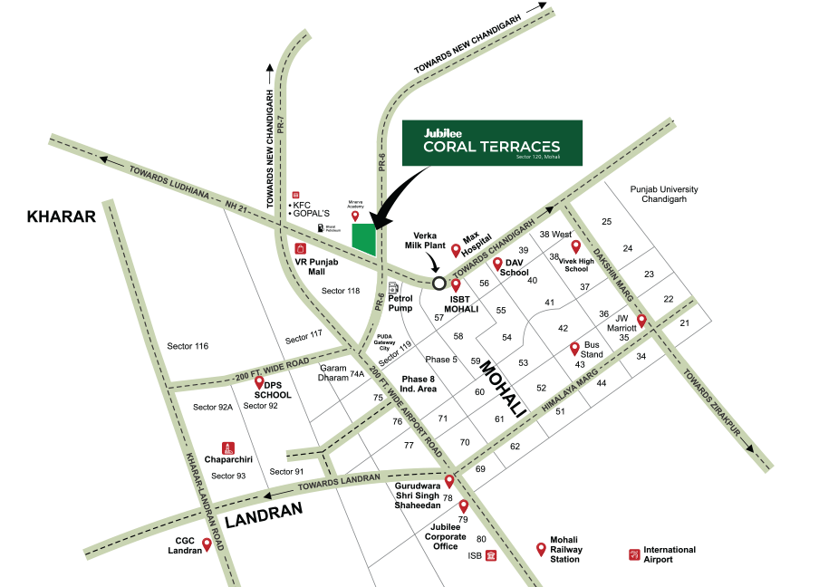 Jubilee Coral Terraces, part of Jubilee Parklane in Mohali, offers over 350 freehold residential plots in a well-planned, gated community. Spanning 25 acres in Sector 120, Mohali, it is divided into two phases: Phase 1 for residential plots and Phase 2 for commercial spaces.